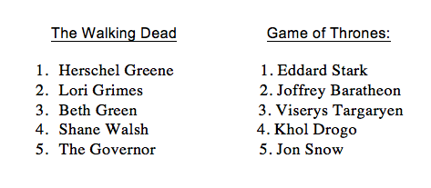 Whether it the "Walking Dead" (WD hereafter) or the "Game of Thrones' (GoT) plenty of people have died in five seasons. And not just ancillary characters; we're talking big time players in both camps.