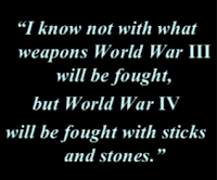 Thus begins World War IV: Humankind's struggle for survival. Precisely what Einstein was speaking of in his quote. And the battle will be fought with sticks and stones.